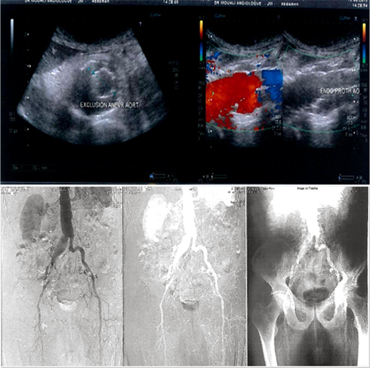 Monsieur X  née le1925, sous oxygéne, 2litres en continu pour emphséme pulmonaire ,repercussion cardiaque droite avec hypertrophie ventriculaire droite, la coronographie est normal pour son age,qui présentait un anévrisme de l’aorte abdominale qui est à 45 mm.avec thrombus murale et un chenal circulant Par contre, il existe un anévrisme iliaque sans aucun collet relié à l 1anévrisme  de l 1aorte abdominale à 39 mm. Devant le tableau d 1un  anévrisme énorme de l 1artère  iliaque primitive sans collet, on est obligé de réaliser la mise en place d 1une  endoprothèse aortique vu que l 1artère iliaque gauche est extrêmement athéromateuse et difficile d1accès,  on décide de réaliser la mise en place d 1une endoprothèse aorto uni iliaque droite avec mise en place d 1un  occluder à gauche associés à un pontage croisé droit 1 gauche.